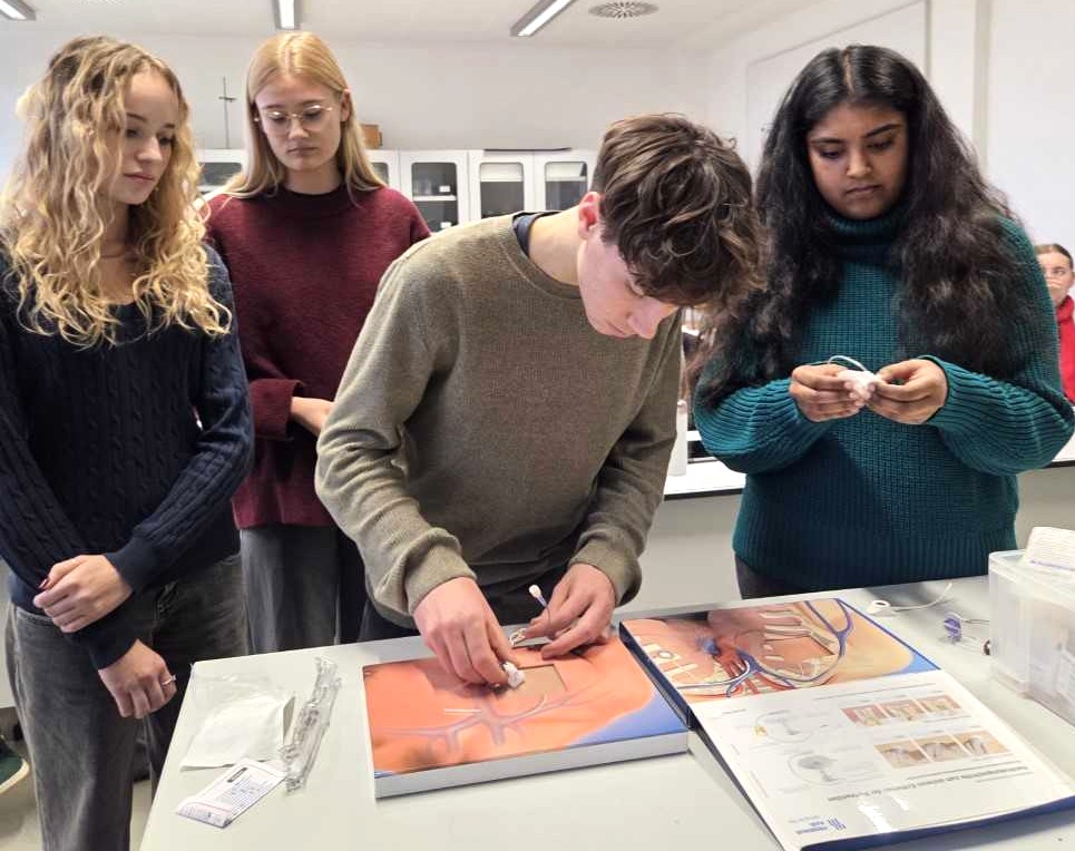 Zum Abschluss des fachlich informativen Vortrages wartete noch ein Highlight in Form eines praktischen Teils auf uns. Wir durften, wie es auch Fachärzte zunächst üben, an einem „Dummy“ das Injizieren und Entfernen einer Portkanüle probieren (s. Bild). Über so eine Portkanüle, die in der Nähe des Herzens implantiert wird, können Infusionen für eine Chemotherapie und/ oder einer immunbiologischen Behandlung direkt in die Hauptschlagader geleitet werden, damit die Medikamente schnell über das Blut im Körper verteilt werden. Das präzise „Anbringen“ dieser Portkanüle war für uns alle wirklich etwas Besonderes.